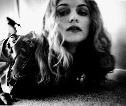 A black and white photo of Heather Graham lying on the carpet. Download.
