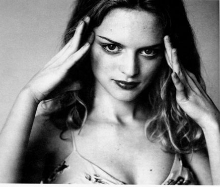 A black and white photograph of Heather Graham with a headache. Download.